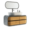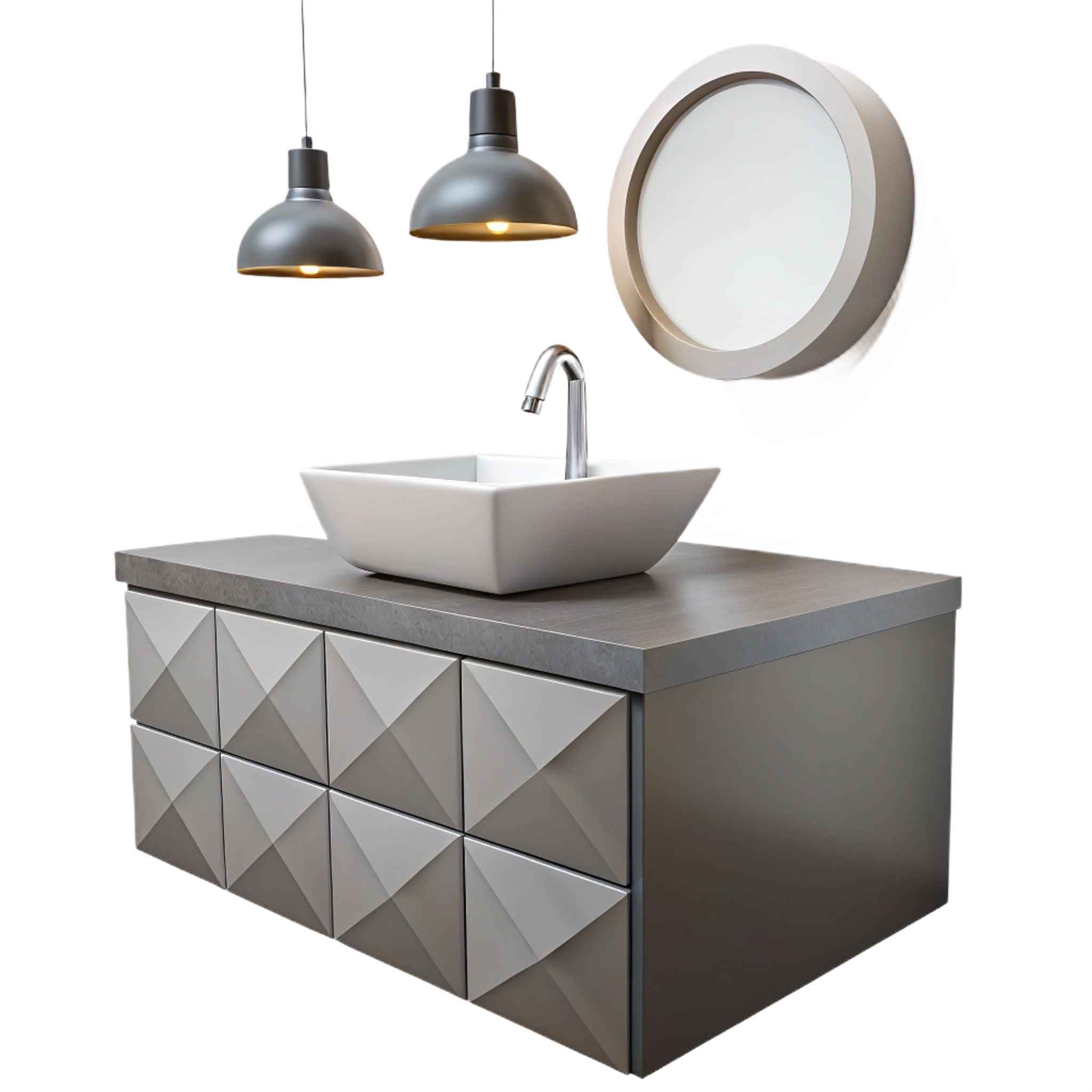 The Urban Edge Vanity Unit showcases bold modern craftsmanship with a striking geometric front pattern. Designed in matte grey tones with a spacious countertop and square ceramic basin, it exudes contemporary luxury. The circular mirror and industrial pendant lights complete the look, making it an ideal centerpiece for stylish urban interiors.